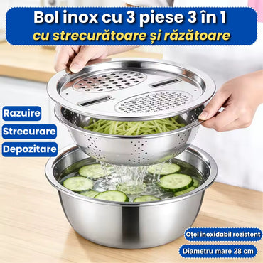 Detalii produs: 🍴 Set complet din inox alimentar – conține bol adânc pentru amestec, sită/scurgător și capac multifuncțional cu diferite tipuri de răzătoare. 🔄 3 răzători...