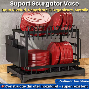 Suport Vase Metalic cu Două Niveluri – Scurgător cu Tavă și Suport Tacâmuri